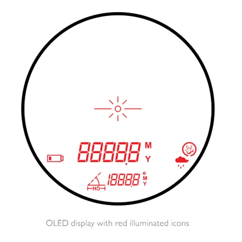 OLED display. Modes: Distance, Horizontal Distance, Angle Compensation, Rain, Hunt.