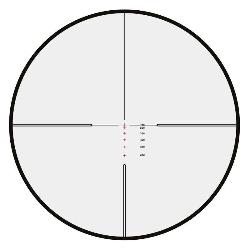 The glass reticle is etched with aim points marked ‘100’ at center and increasing by 100 for each increment out to ‘600’. The reticle can be used for yards or meters depending on magnification setting.