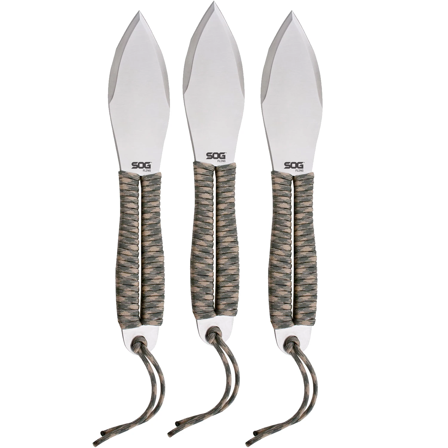 The Fling knives are styled after traditional throwing knives and perfect for backyard competitions. Each knife handle is wrapped with 7 feet of paracord, giving you a total of 21 feet, prefect for those unexpected situations. Also included with the three knives is a ballistic nylon carry sheath. See who can hit the bull’s eye first! Item FX41N-CP